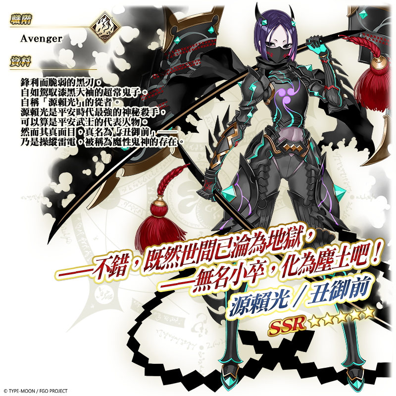 ★5(SSR)源賴光/丑御前 平安時代最強的神秘殺手「★5(SSR)源賴光/丑御前」,以職階 Avenger 現身,透過寶具「牛王反轉.迅雷風烈」的施展,將對敵方全體發動強大的(擁有地之力的敵人)特攻攻擊、爆擊率下降 3 回合及低機率賦予暈眩狀態。