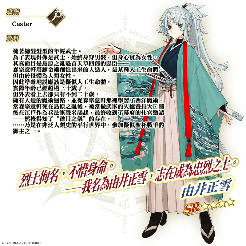 ★4(SR)由井正雪 擬似人工生命體,志在成為忠烈之士的「★4(SR)由井正雪」,以 Caster 職階現身,透過寶具「烈士徇名.不惜身命」的施展,將恢復我方全體 HP、〔處於 Quick 指令卡性能提升狀態(除無法解除的狀態)〕的我方全體攻擊力提升、〔處於 Arts 指令卡性能提升狀態(除無法解除的狀態)〕的我方全體爆擊威力提升、〔處於 Buster 指令卡性能提升狀態(除無法解除的狀態)〕的我方全體寶具威力提升。 ![]() |