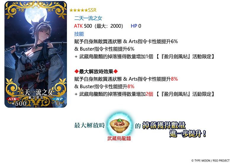 在本次聯動活動「盈月劍風帖」裝備上述 3 種限時概念禮裝進行通關,將可提升對應「武藏烏龍麵」、「江戶飯糰」及「東之柿餅」等活動道具的掉落獲得數量。