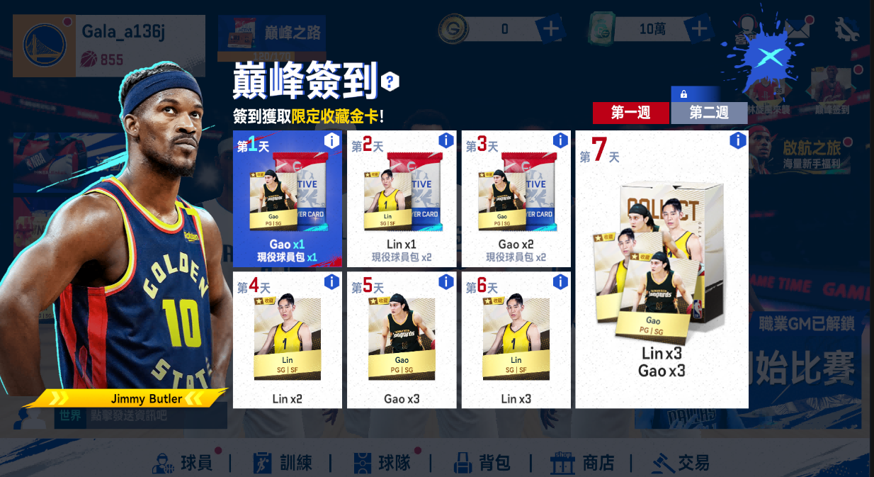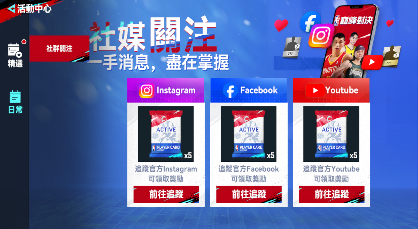開服期間,天天登入就送驚喜豪禮!不僅能獲得林書緯、高錦瑋兩位人氣台籃球星,更可領取大量球員包、禮券等實用獎勵。此外,只要關注官方 Facebook 粉絲團、YouTube 頻道、Instagram 官方帳號,還可額外獲得大量現役球員包,助你快速打造夢幻陣容!