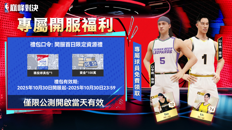 為慶祝盛大公測,官方推出多項開服專屬福利,不僅有限時超值禮包可供領取,更加碼贈送台灣職籃人氣球星林書緯與高錦瑋,輸入對應的禮包碼即可免費獲得,此外,只要每天登入遊戲,還能獲得大量的球員包、禮券等驚喜豪禮,連續獎勵天天不間斷。