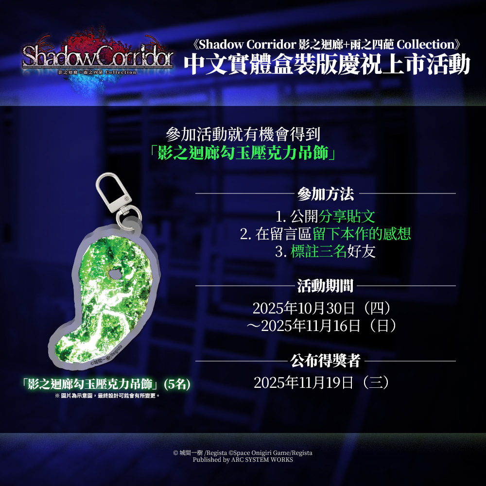 為慶祝《Shadow Corridor 影之迴廊+雨之四葩 Collection》中文實體盒裝版上市,從今天起舉辦抽獎活動。公開分享活動貼文並在留言區留下關於本作的感想,就有機會得到「影之迴廊勾玉壓克力吊飾」。