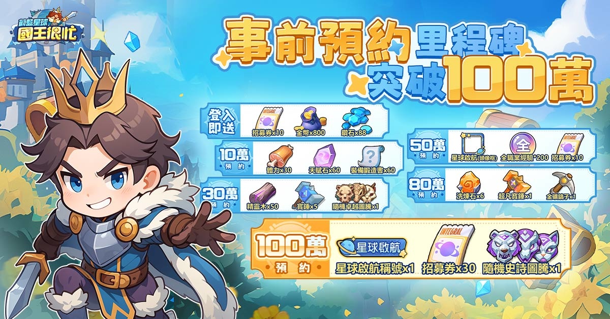 官方宣布《蔚藍星球:國王很忙》事前預約人數已突破 100 萬,達成全檔位獎勵目標。為感謝廣大玩家的關注與支持,現在登入即可於「英雄手禮」中領取(包含招募券、鑽石、專屬頭像框與稱號在內)的多項獎勵!