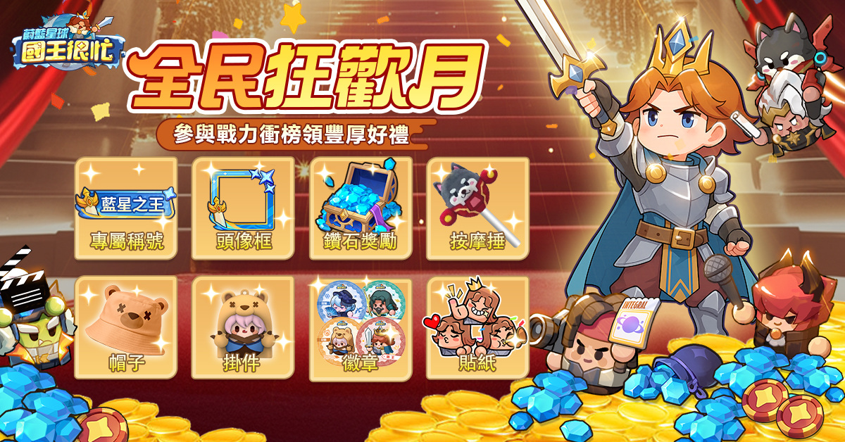 官方舉辦「全民狂歡月」活動,參加戰力衝榜即可贏取鑽石、頭像框及實體週邊獎勵。活動期間,總伺服器中戰力排名前 30 的玩家將會獲得豐厚獎勵!不僅如此,若全服超過 50%玩家主線通關達第 20 關,所有玩家還能獲得全民參與獎!