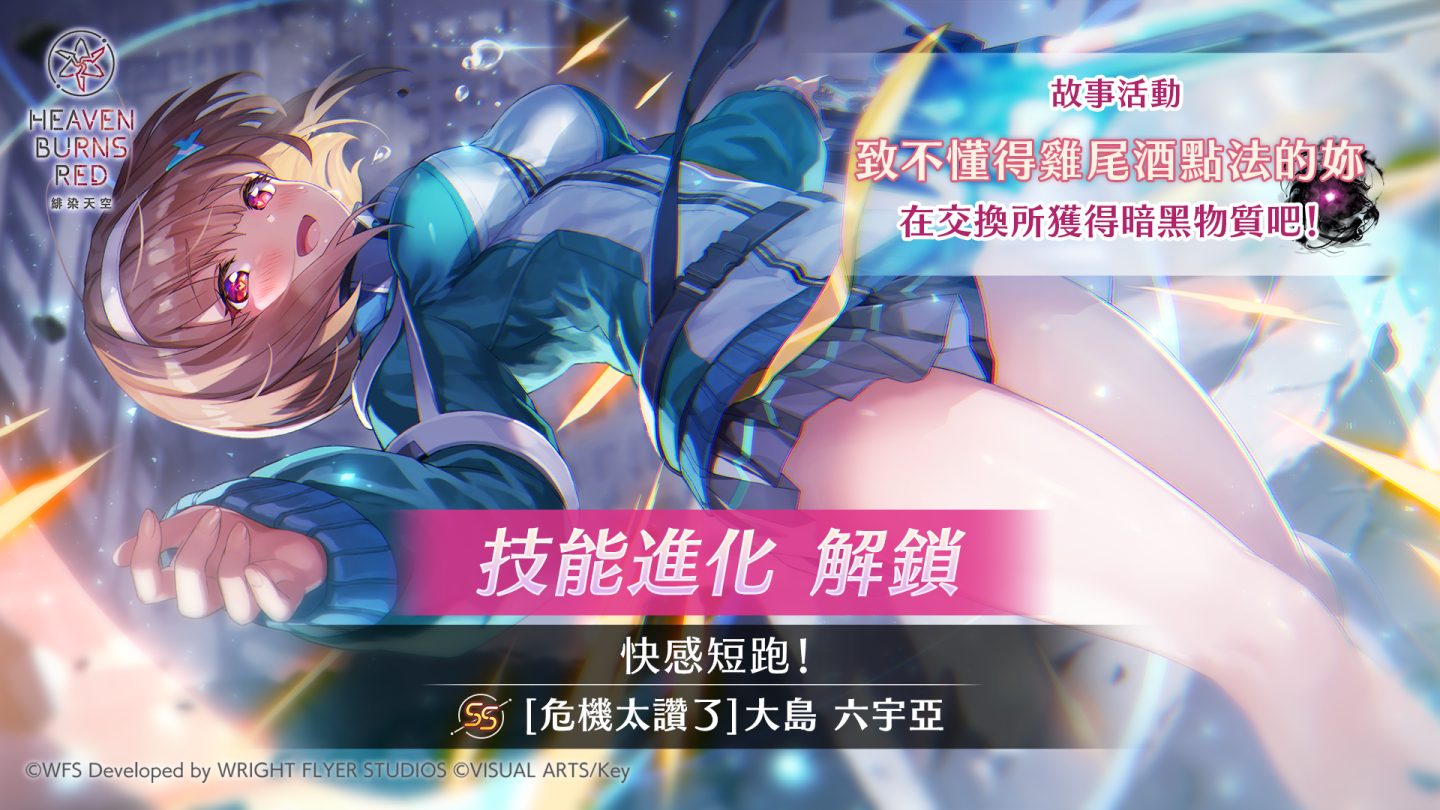 2025 年 10 月 31 日(五)10:00 起,於故事活動「致不懂得雞尾酒點法的妳」的活動交換所中,可獲得專用素材道具「暗黑物質」。使用「暗黑物質」即可讓 SS【危機太讚了】大島六宇亞的 EX 技能「快感短跑!」進化。
