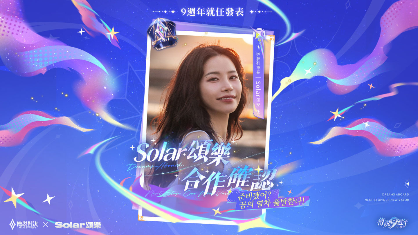 韓國超人氣歌手 Solar 頌樂為傳說九週年獻上專屬主題曲「Come Away with Me (9等你)」!歌曲於 10 月 25 日 全面上線後即引發粉絲熱烈討論。 Solar 頌樂以標誌性的溫柔嗓音與細膩情感,唱出「無論何時,都等你上車玩傳說」的暖心呼喚,將韓系浪漫與傳說對決的熱血旅程完美融合,為九週年揭開夢幻序章。