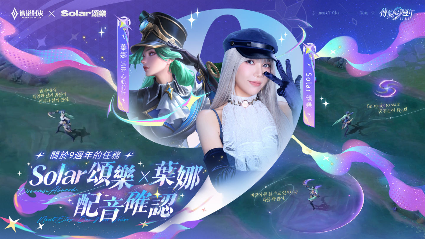 《Garena 傳說對決》邁入第九週年,特別邀請韓國實力派歌手 Solar 頌樂攜手推出全新九週年主題曲「Come Away with Me(9等你)》,更祭出超狂福利活動,參與活動即可免費兩款全新造型「蘇 巡夢.浮生領航」以及 Solar 頌樂親自配音的「葉娜 巡夢.心軌前行」,敬邀玩家一同上線領取好禮,慶祝九週年生日!