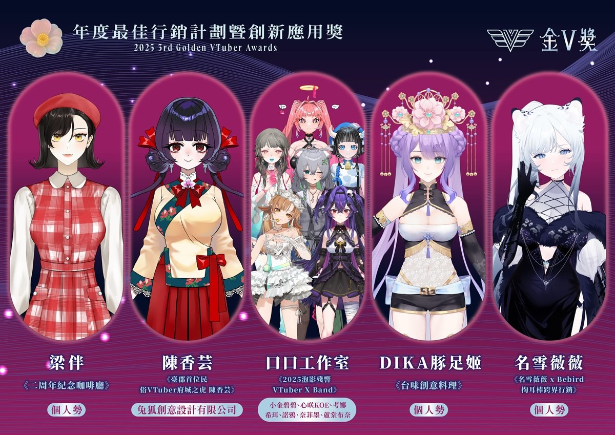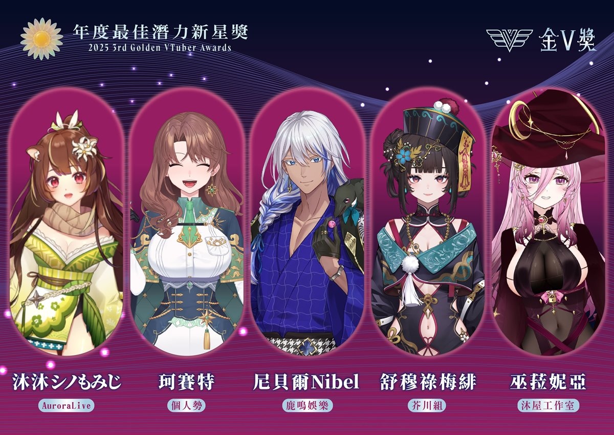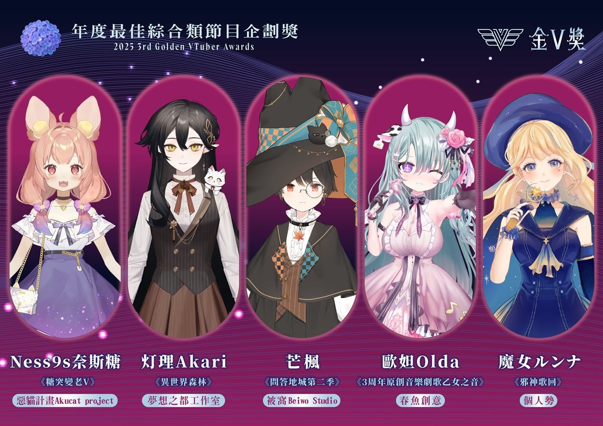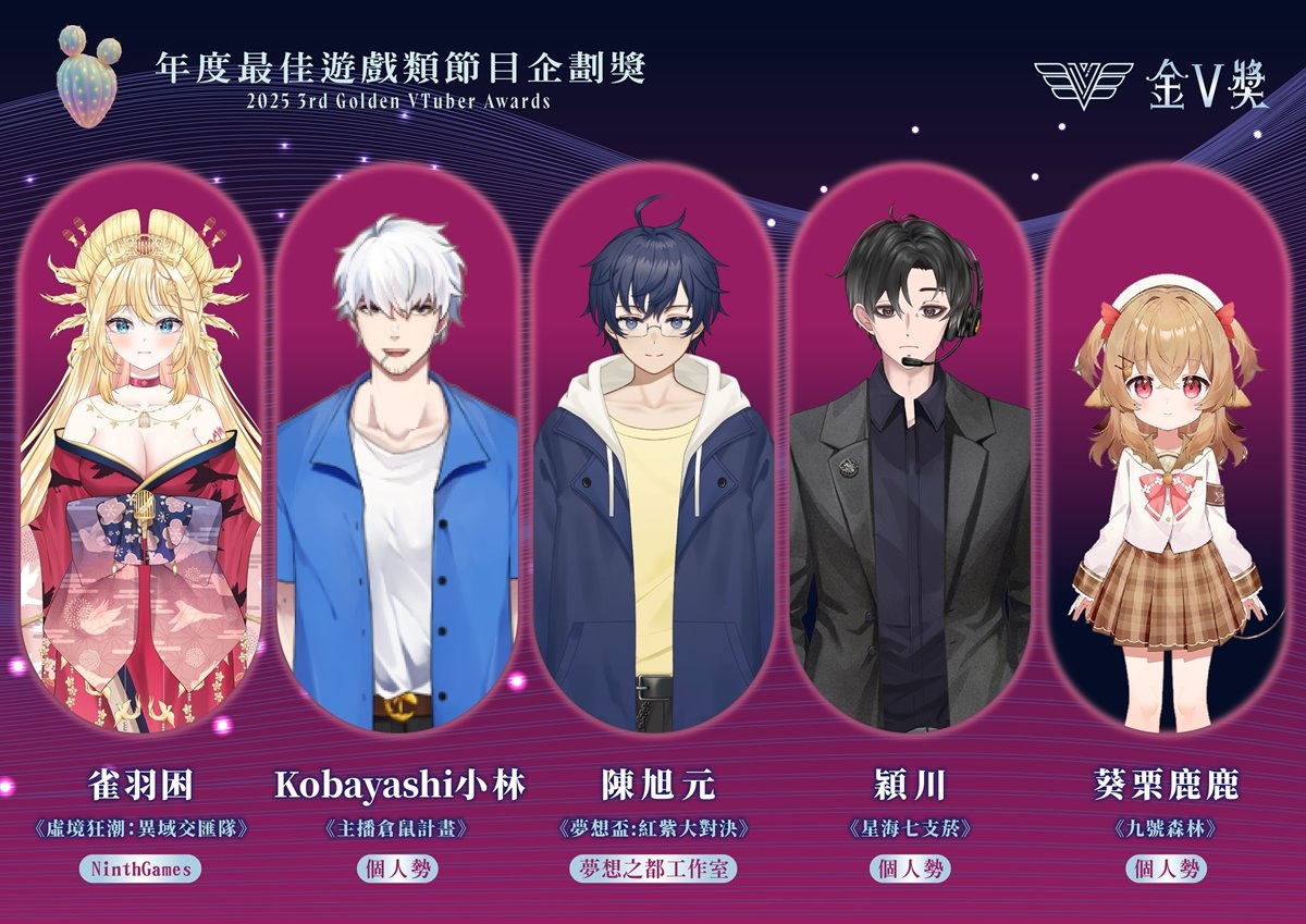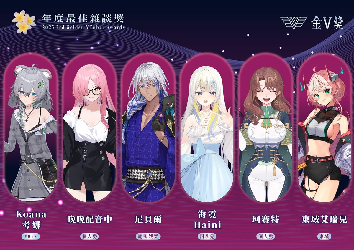 公共電視主辦之 2025 年第三屆「金V獎」昨(2)日線上直播公布入圍名單,今年總徵件數達 358 件,其中「年度最佳演唱實力獎」再創新高達 88 件、新設立的「年度最佳雜談獎」56 件、「年度最佳翻車沒極限獎」50 件,為此次投稿數競爭最激烈的前三名。雜談獎為今年新設立的獎項,不靠畫面取勝,而是以過往直播的無剪輯五分鐘雜談進行評分,最後增額入圍六位,由考娜、晚晚配音中、尼貝爾、海霓、珂賽特、東域艾瑞兒共同角逐,用 VTuber 最基本的武器「說話」來一決勝負。
