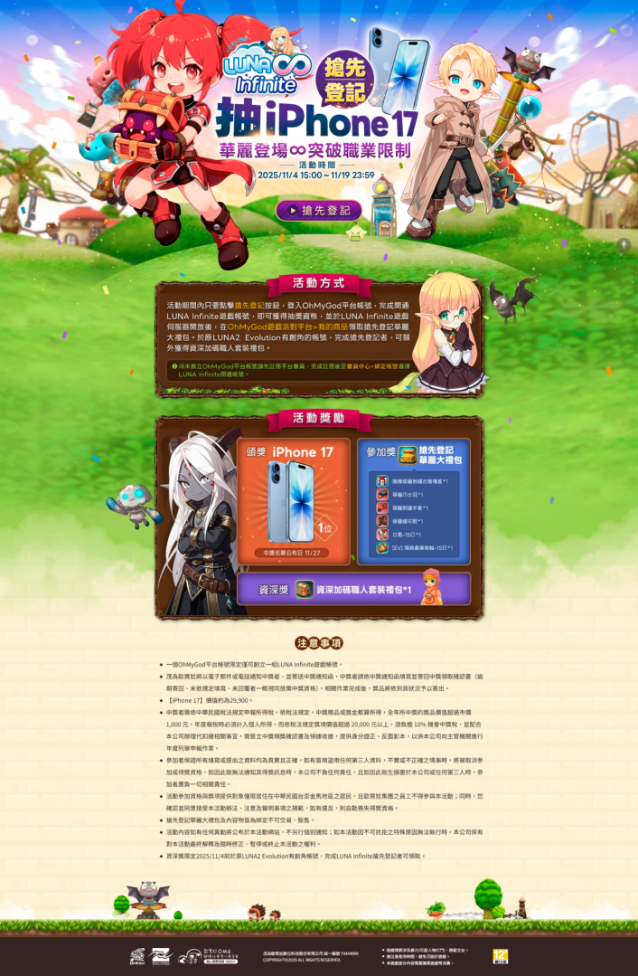 《LUNA Infinite》預登錄活動自 11 月 4 日(二)下午 3 點至 11 月 16 日(日)晚上 11:59 止。完成預約的玩家立即可獲得遊戲專屬虛寶大禮包,包含角色養成道具、鑽石等豐富獎勵。此外,官方更祭出超級大獎 iPhone 17 抽獎,參與預約就有機會把最新旗艦手機帶回家!
