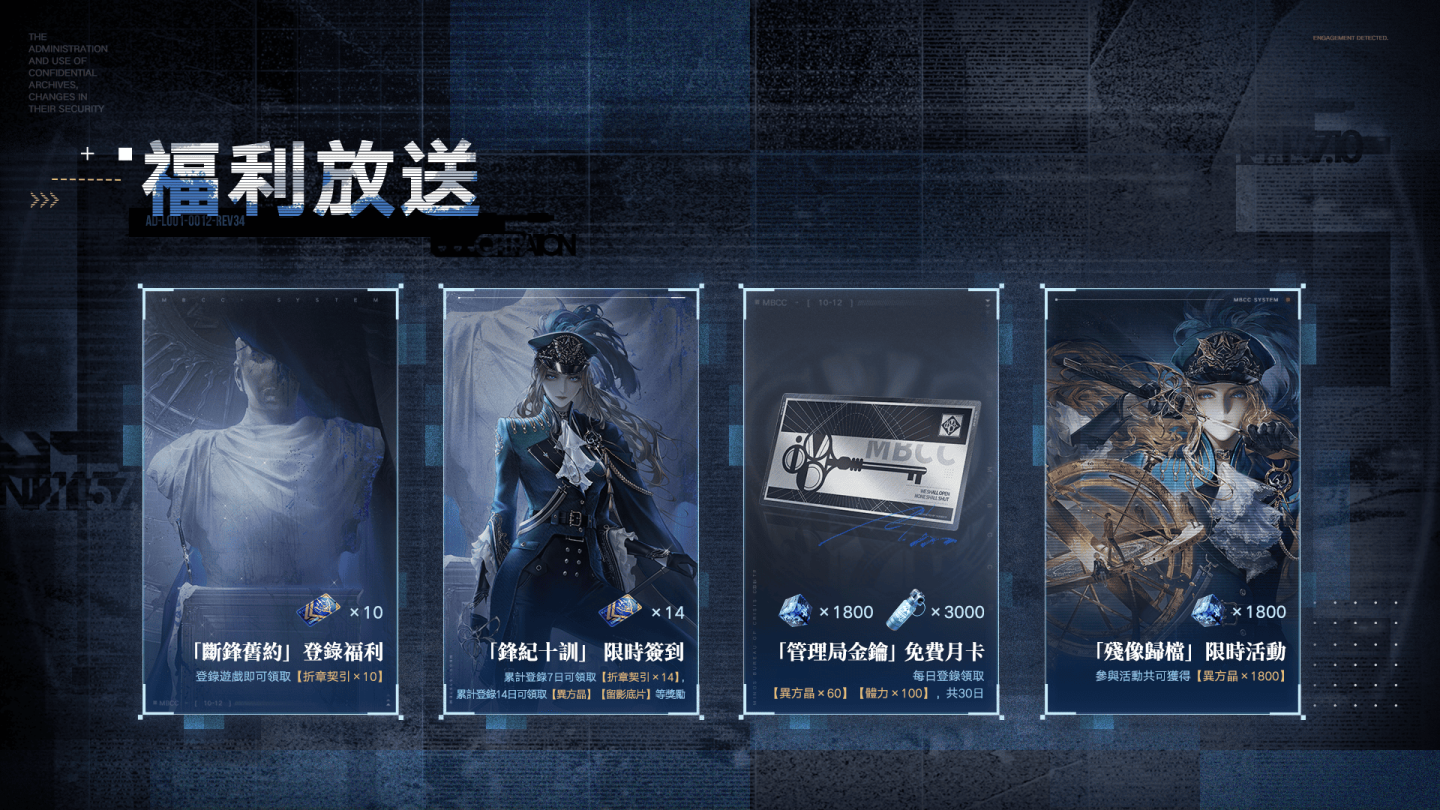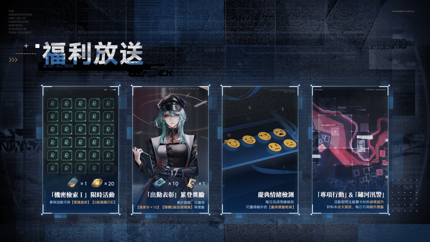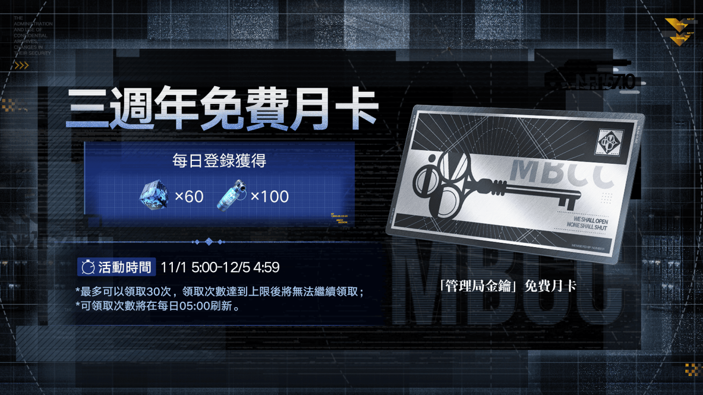 即日起~12/5 登錄遊戲即可領取「免費月卡」。結合先前的夏日福利活動,於 12/2 前通關主線 Re4-12 即可領取指定「S級禁閉者自選×1」,三週年相關豐富獎勵活動,總計送出超過 60 抽及大量養成材料,新手更可領取超過 110 抽以上資源!