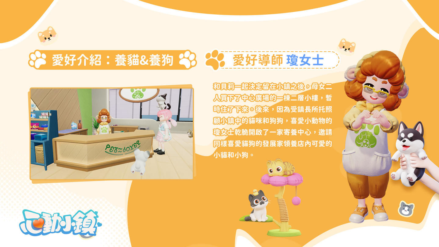 小鎮的中心廣場上有著瓊女士經營的「寵物之家」,裡面每天都有可愛的小貓和小狗等待發展家領養。「不同的貓咪和狗狗有著不同的性格」,或是黏人,或是獨立,選擇與你最性情相投的小夥伴吧。