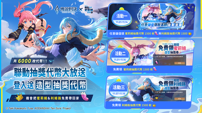 聯動超級優惠開跑!在活動期間登入遊戲即可免費領取聯動造型抽獎代幣,儲值任意額度再加碼領「蜜莉姆」抽獎代幣 1,500 枚與「利姆路」抽獎代幣 1,500 枚。