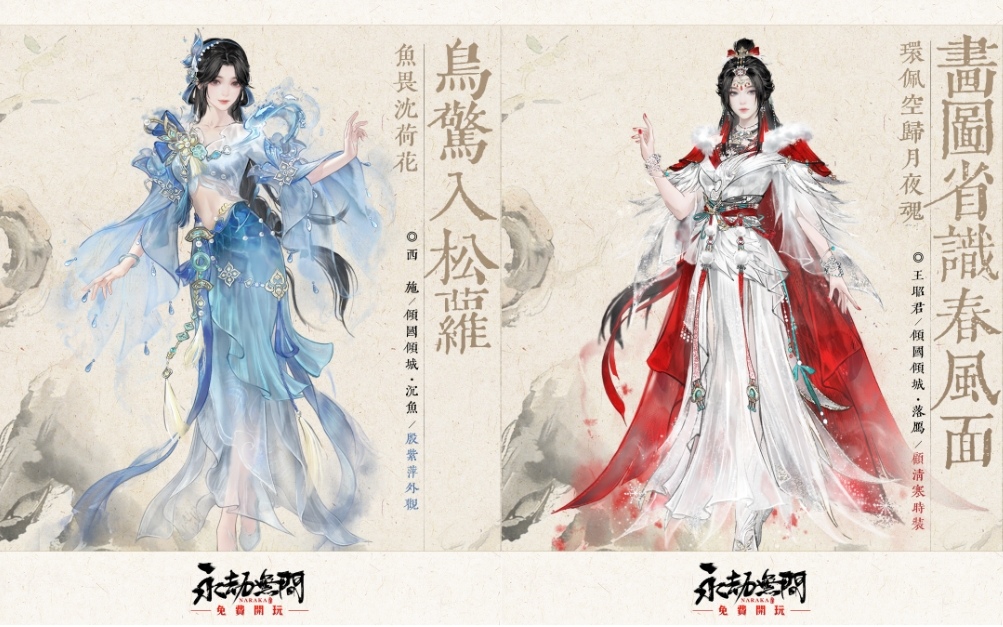 四大美人下凡《永劫無間》!全新傾國傾城系列時裝華麗登場!以歷史四大美人「西施、王昭君、貂蟬、楊貴妃」為靈感設計,融合水墨筆韻與東方美學,將古典柔情與俠者風骨完美交融,為永劫世界再添上一抹詩意與浪漫。