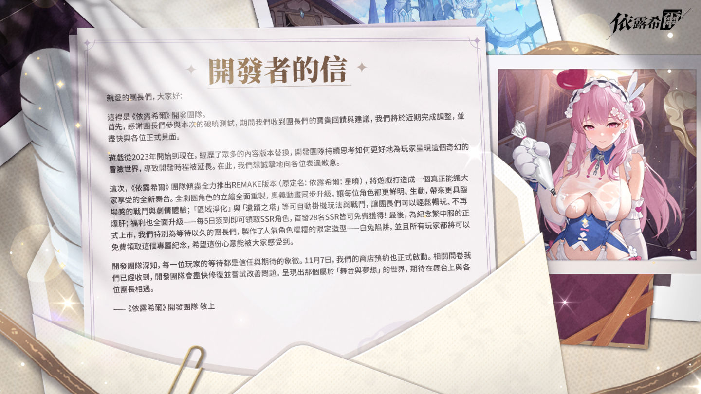 隨著破曉測試落幕,《依露希爾》官方開發團隊特別獻上「開發者的信」,向所有參與測試的團長大人表達誠摯感謝。團隊在信中提到,這次 Remake 版本的推出是為了打造一個能讓更多人共享的全新舞台,無論角色建模、戰鬥演出或音效表現,都進行了全面升級,期望呈現更具臨場感的真香冒險體驗。