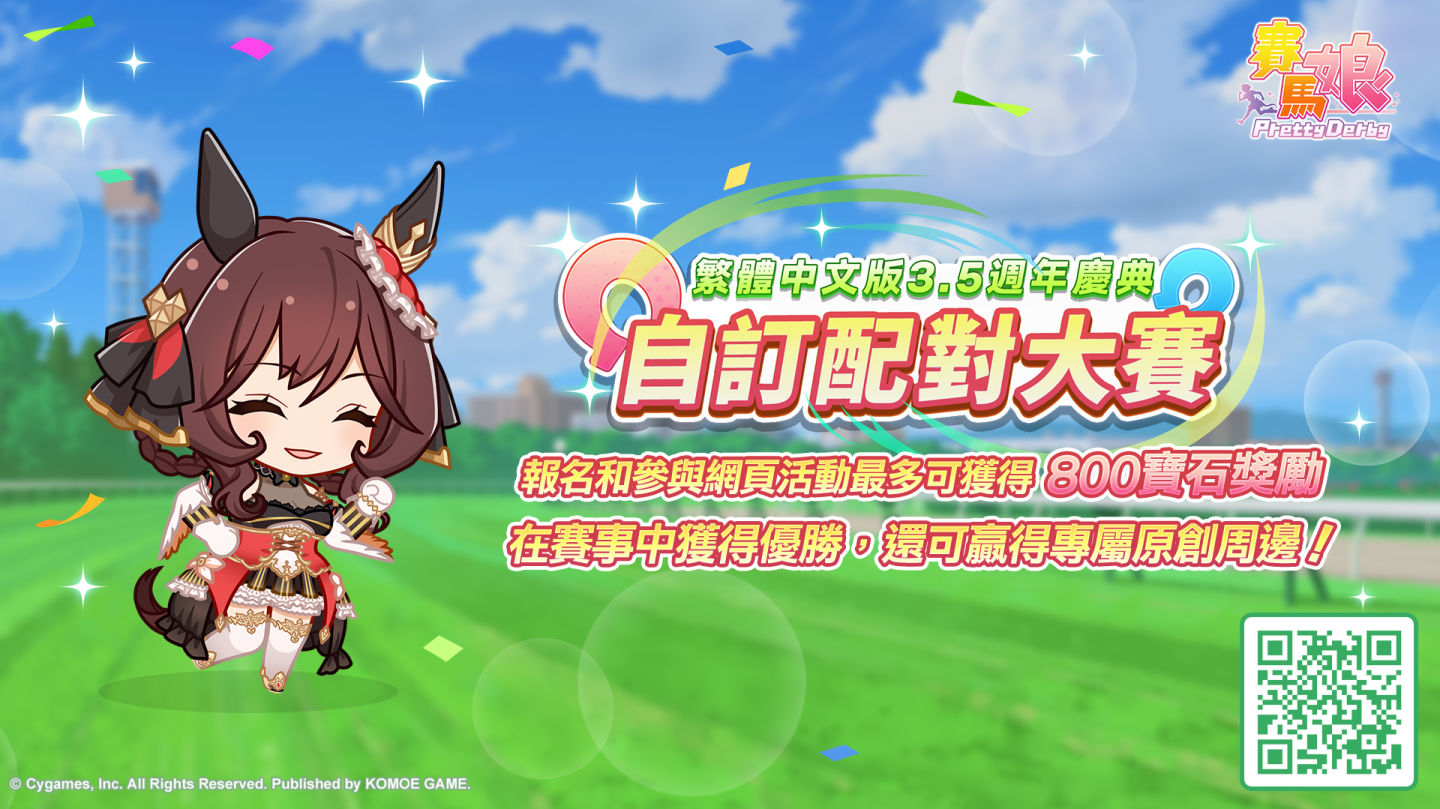 各位訓練員,為慶祝《賽馬娘 Pretty Derby》繁體中文版 3.5 週年,「繁體中文版 3.5 週年慶典 自訂配對大賽」開賽!本屆賽事將擴大規模,增加參賽名額,活動自即日起開始,報名和參與網頁活動最多可獲得 800 寶石獎勵,在賽事中獲得優勝,還可贏得專屬原創周邊!
