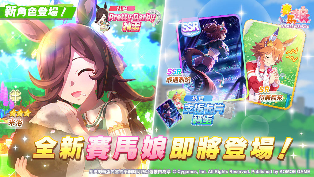 日本 Cygames 開發、小萌科技代理的養成手機遊戲《賽馬娘 Pretty Derby》繁體中文版,將於 11 月 10 日 12:00 推出全新★3 特選培育賽馬娘【Yummy Dreamy Fairy】米浴,以及全新 SSR 支援卡片【舞台就此揭幕】緞通烈焰、SR 支援卡片【靠護身符力量福德圓滿!】待兼福來。