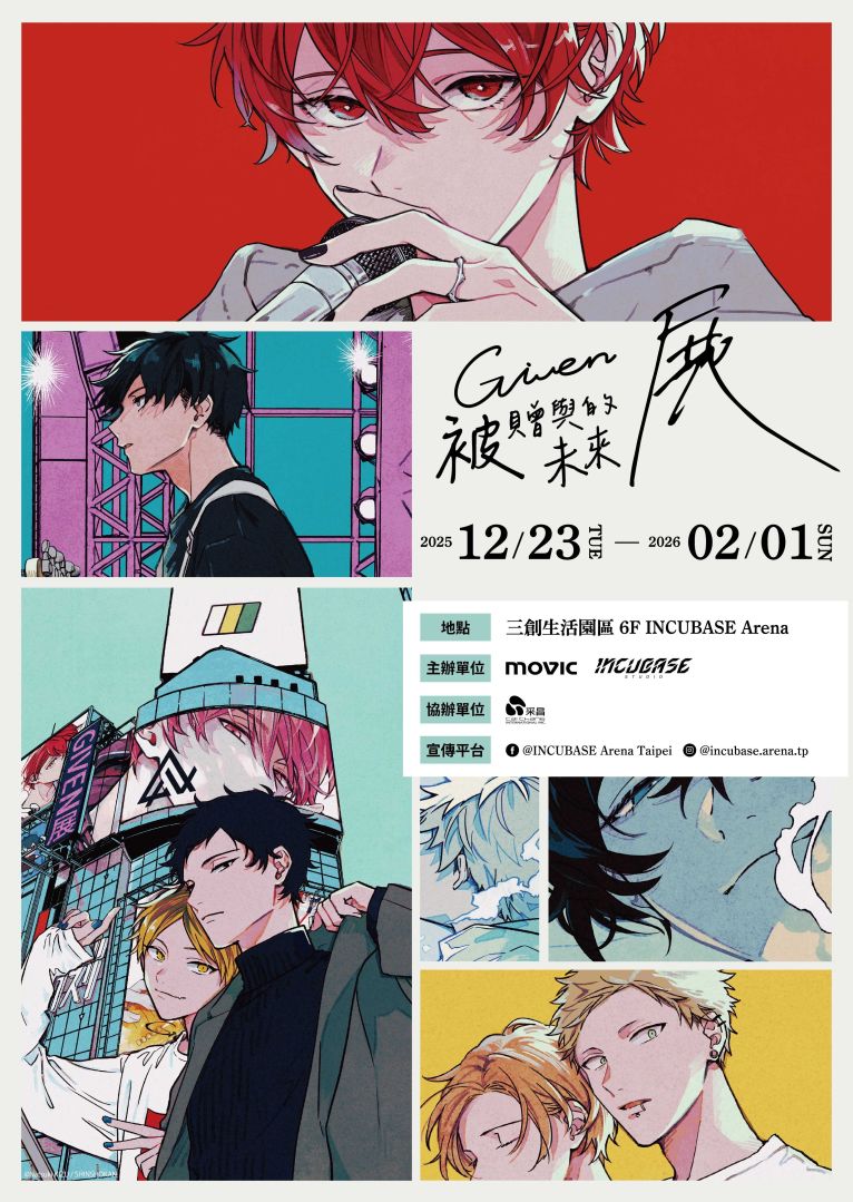 超人氣BL作品《GIVEN 被贈與的未來》,終於要在台北開展啦!本展將於 2025/12/23 至 2026/2/1 在台北三創生活園區 6 樓盛大展出,完整公開漫畫複製畫及動畫珍貴圖像,角色設定圖等,現場特別重現樂團初登舞台的經典影片,還有打造多幅超大型繪製牆,放大單人特寫及雙人對視的悸動場景與樂團合照,全面解鎖粉絲心中最揪心的回憶!