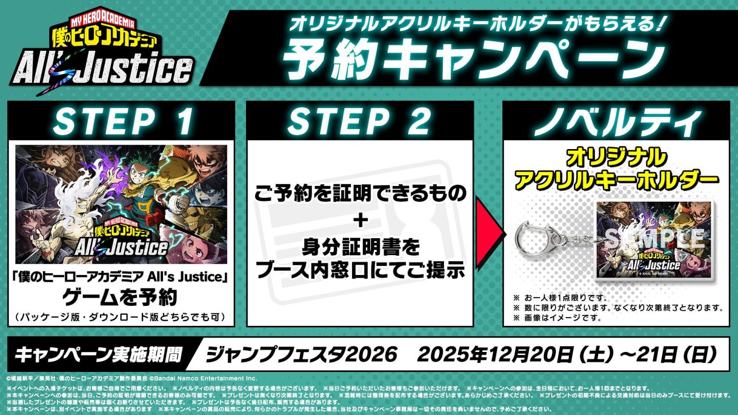同時官方也宣佈,本作將會預定參展於 2025 年 12 月 20 日~21 日兩天在日本幕張展覽館舉辦的「Jump Festa 2026」,屆時將會在現場開放試玩,並將贈送預約玩家限定鑰匙圈等特典作為獎勵,讓現場玩家有得玩又有得拿。有機會親臨現場的玩家們,屆時可別錯過這個難得機會搶先試玩遊戲並拿取好康。
