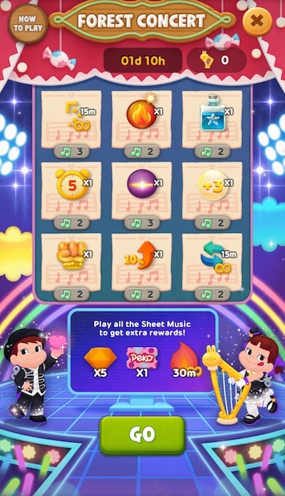 在活動期間內,只要通過一般新關卡即可獲得「樂器(豎琴)」,使用獲得的樂器即可挑戰取得樂譜中的道具,成功挑戰後便可以獲得相對應的活動獎勵喔!