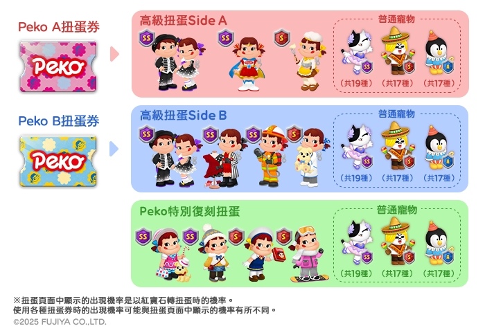 「Idol Peko & Poko」、「Hero Peko」、「Pastry chef Peko」、「Designer Peko」、「Firefighter Peko」和「Veterinarian Peko」都將化身為「合作活動限定寵物」在高級扭蛋中登場!透過達成遊戲中各種合作活動任務獲得的「Peko 扭蛋券」可用來轉高級扭蛋!快把握機會讓各種「Peko」成為你的過關夥伴,一起在遊戲中闖關吧!