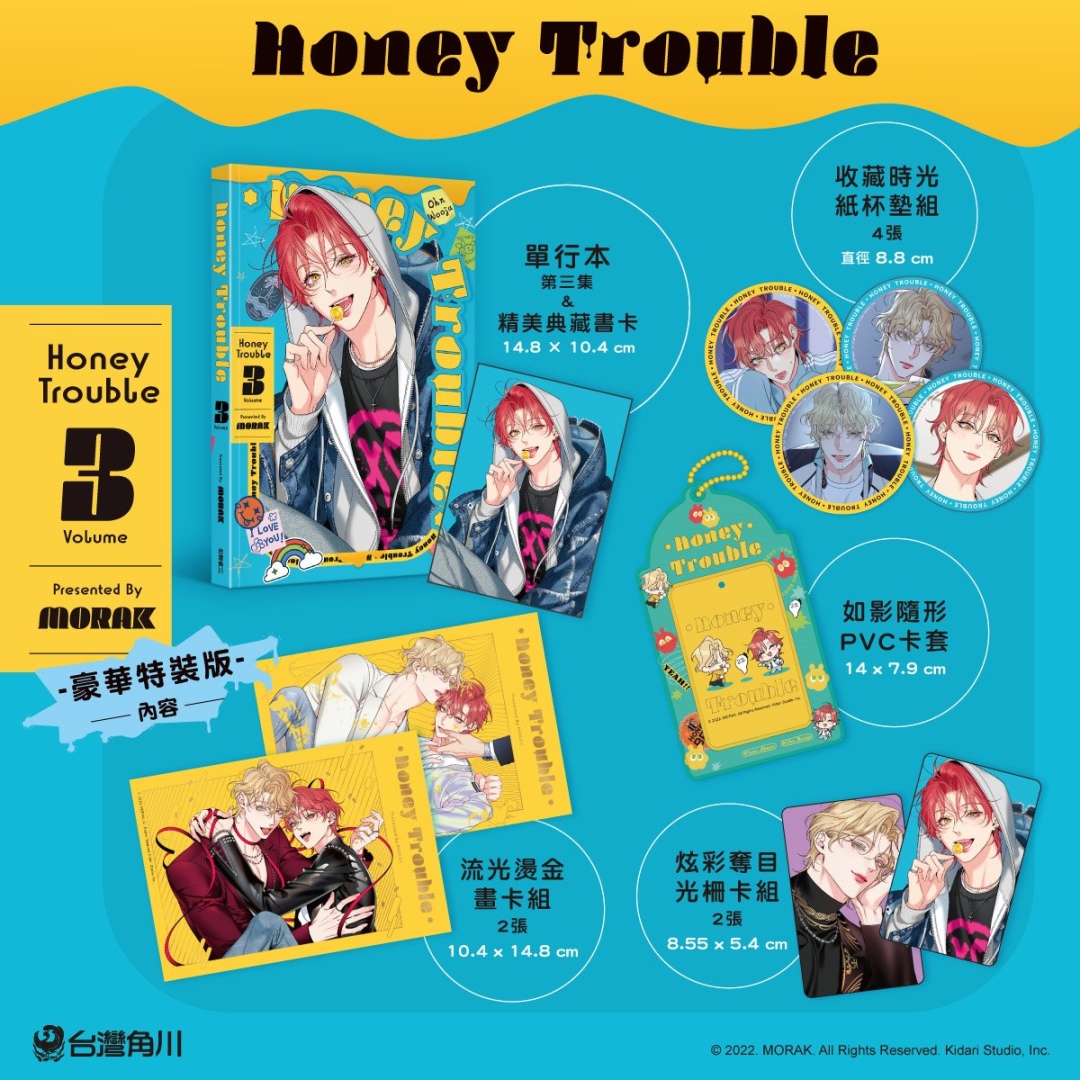 韓國超人氣BL《Honey Trouble》自推出以來在讀者間掀起熱烈討論,台灣角川宣布第三集即將於 11/24 上市,同步推出收錄多款限量特典的豪華特裝版,帶來更多心跳的全新篇章!
