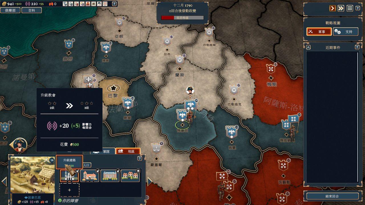 在你占領的地區發展經濟,修建農田、工廠、教堂等設施以增加資源產出。透過修建派系建築來提升各階層支持度,在國民公會中為你的派系贏得更多選票。