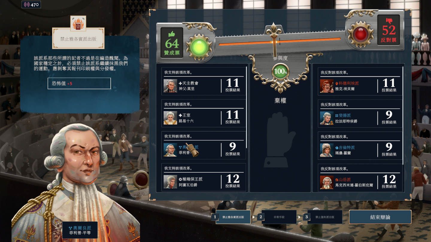 在國民公會上,與諸多著名歷史人物共同決定法蘭西的未來。花費影響力提出法案,並與其他代表投票表決。在結果揭曉前,拉攏棄權政客,進行私下交易以換取支持,扭轉投票局勢,將法蘭西重塑成你理想中的模樣。