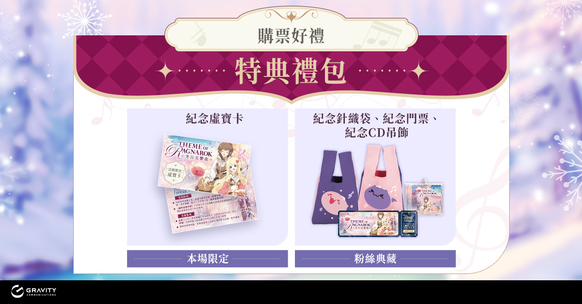 自今日起,音樂會門票已於 Opentix 售票系統正式啟售,凡購票入場者,皆可憑票根於現場兌換「音樂會紀念特典禮包」,內含紀念針織袋、票卡、CD 吊飾與虛寶卡各一份,誠意滿滿。