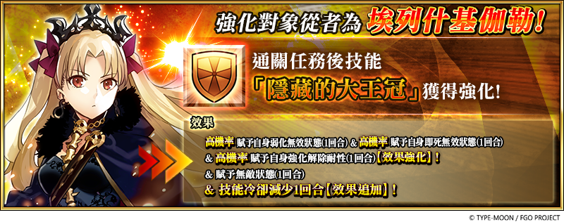 自 2025 年 11 月 11 日(二)16:00 後起,迦勒底之門中將常駐追加「★4(SR)阿爾托莉亞.潘德拉剛〔聖誕Alter〕」、「★4(SR)貞德.Alter.Santa.Lily」的特別任務「從者強化任務」。自 2025 年 11 月 13 日(四)16:00 後起,將常駐追加「★5(SSR)埃列什基伽勒」的特別任務「從者強化任務」,通關任務不僅可以強化對象從者,更能獲得聖晶石獎勵。