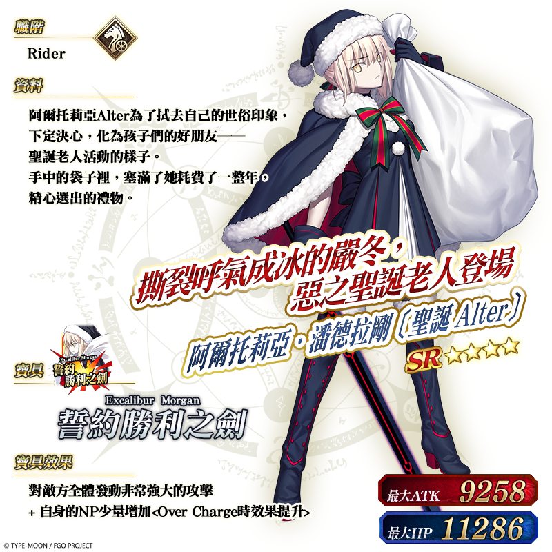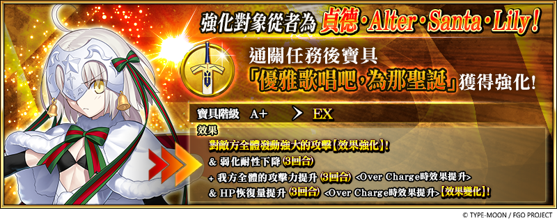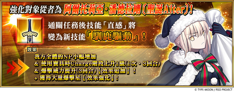 自 2025 年 11 月 11 日(二)16:00 後起,達.文西工房的「巡靈之葉兌換」將常駐追加「★4(SR)阿爾托莉亞.潘德拉剛〔聖誕Alter〕」、「★4(SR)貞德.Alter.Santa.Lily」及「★4(SR)迦爾納〔Santa〕」等 3 騎活動贈送從者,還有寶具強化專用靈基、靈基再臨素材及從者幣,本次也包含「★4(SR)阿蒂拉.the.San〔ta〕」的從者幣。