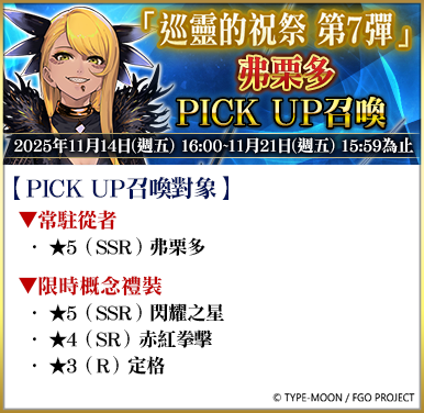 自 2025 年 11 月 11 日(二)16:00 至 2025 年 11 月 21 日(五)15:59 期間舉辦的「巡靈的祝祭 第7彈」Pick Up 召喚,將登場限定從者「★5(SSR)阿爾托莉亞.潘德拉剛〔Alter〕〔Rider〕」、「★5(SSR)伊絲塔〔Archer〕」、「★5(SSR)埃列什基伽勒」及常駐從者「★5(SSR)弗栗多」等在內的 4 騎從者的4種召喚卡池。而各個卡池中,都包含「巡靈的祝祭 第7彈」對象從者首次登場的活動的限時概念禮裝。
