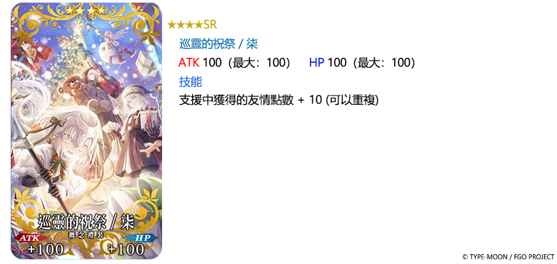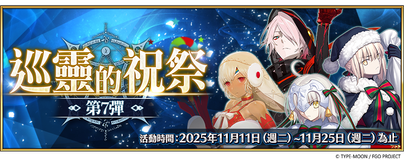 自 2025 年 11 月 11 日(二)16:00 至 2025 年 11 月 25 日(二)12:59 期間,強化「巡靈的祝祭 第7彈」相關從者時,獲得經驗值將限時提升為 2 倍;在所有任務中,可以獲得的羈絆點數將限時提升 20%。同(11)日 16:00 至 2025 年 12 月 9 日(二)23:59 期間,「巡靈的祝祭 第7彈」相關從者在所有任務中,將被限時賦予「自身的攻擊威力提升 50%」的效果。