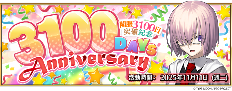 為紀念《FGO》繁中版上線 3,100 日,將舉辦「上線 3,100 日紀念活動」,完成通關「特異點F 燃燒污染都市 冬木」的御主們,自 2025 年 11 月 11 日(二)04:00 至 2025 年 11 月 12 日(三)03:59 期間登入,即可領取「聖晶石 10 個」。