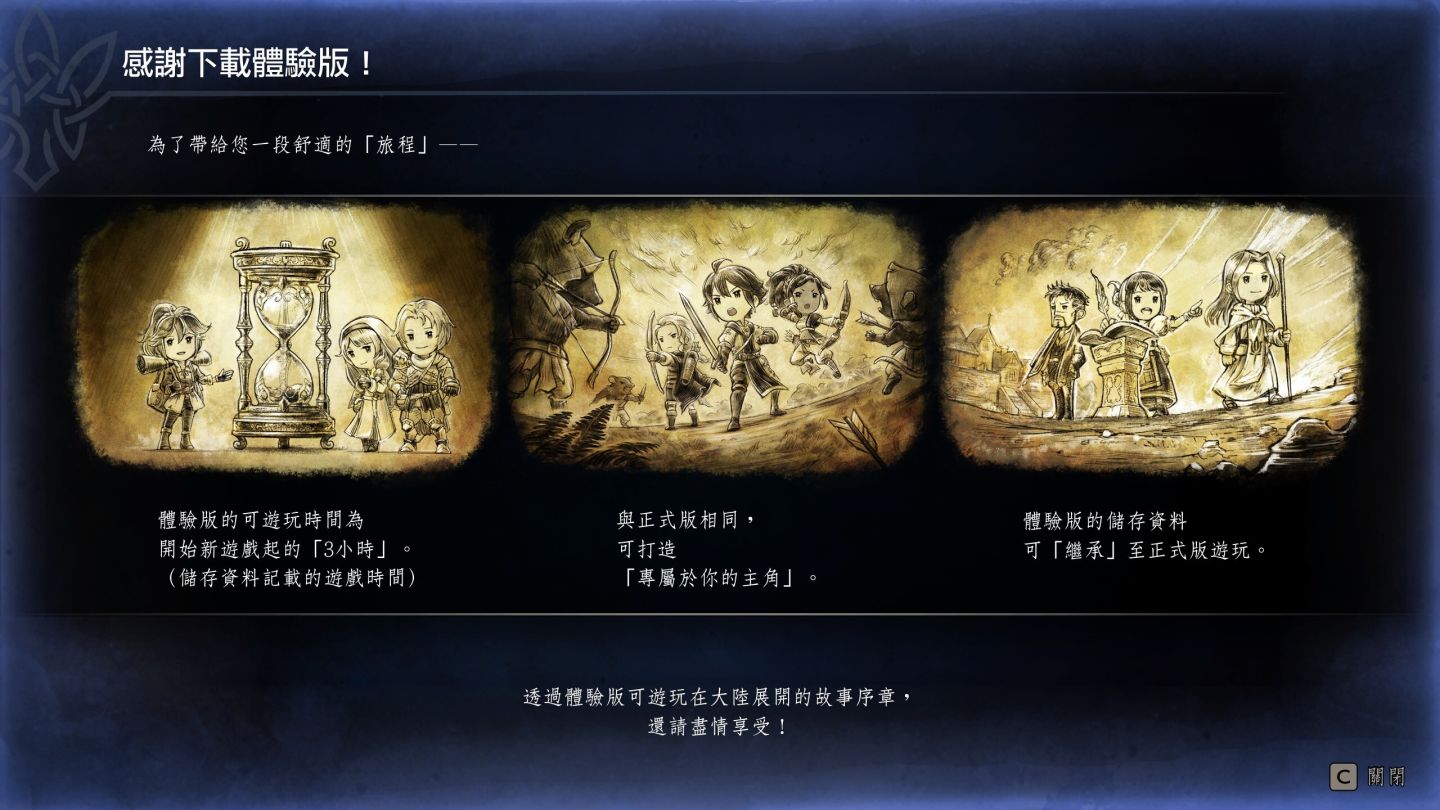 1、體驗版的可遊玩時間為開始新遊戲起的「三小時」。