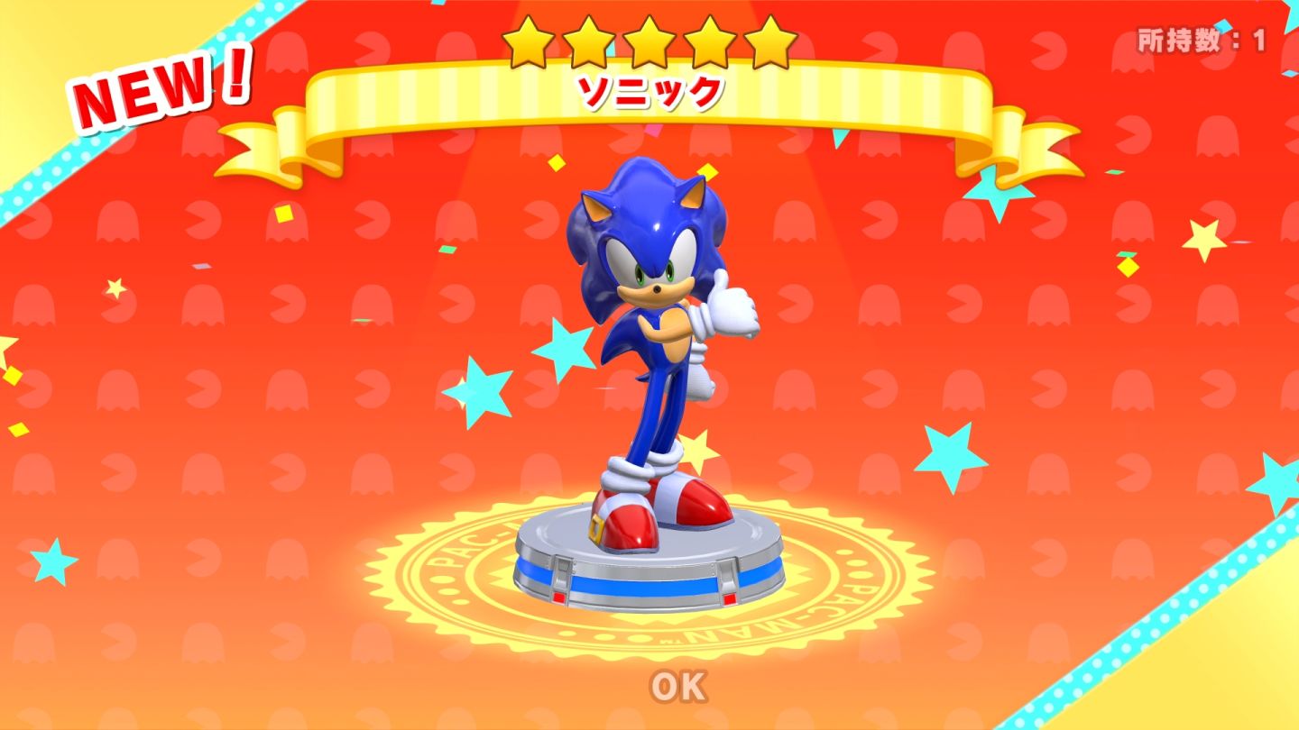 PAC-MAN 變身為索尼克。包含索尼克最著名的藍色刺刺髮型、宛如註冊商標的白色手套與紅鞋,玩家將可以獲得充滿講究設計的索尼克合作服裝。MEGA PAC-MAN 的狀態中外觀也會產生變化。伴隨著充滿速度感的動作及索尼克服裝,玩家將可以享受些許不同的 PAC-MAN 冒險。