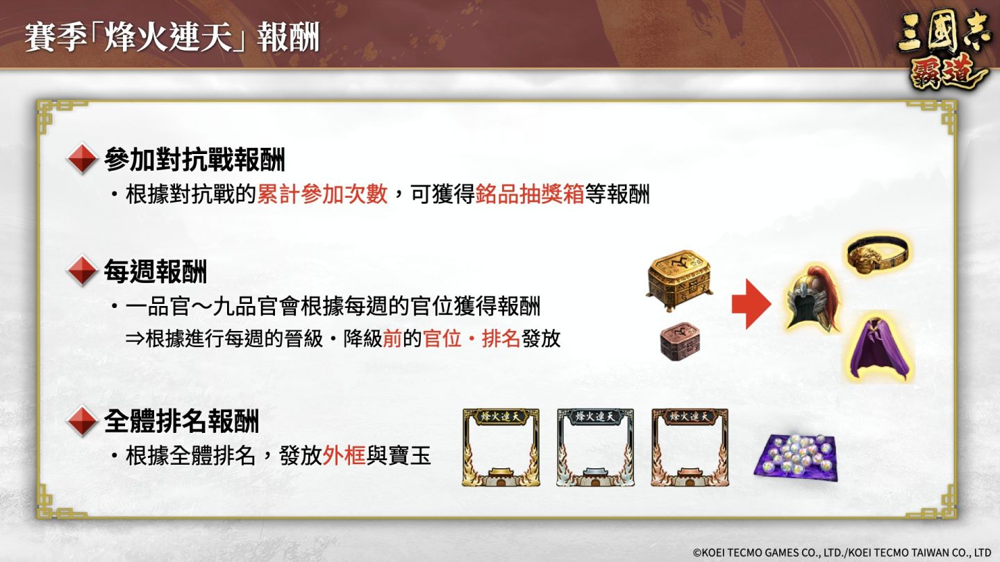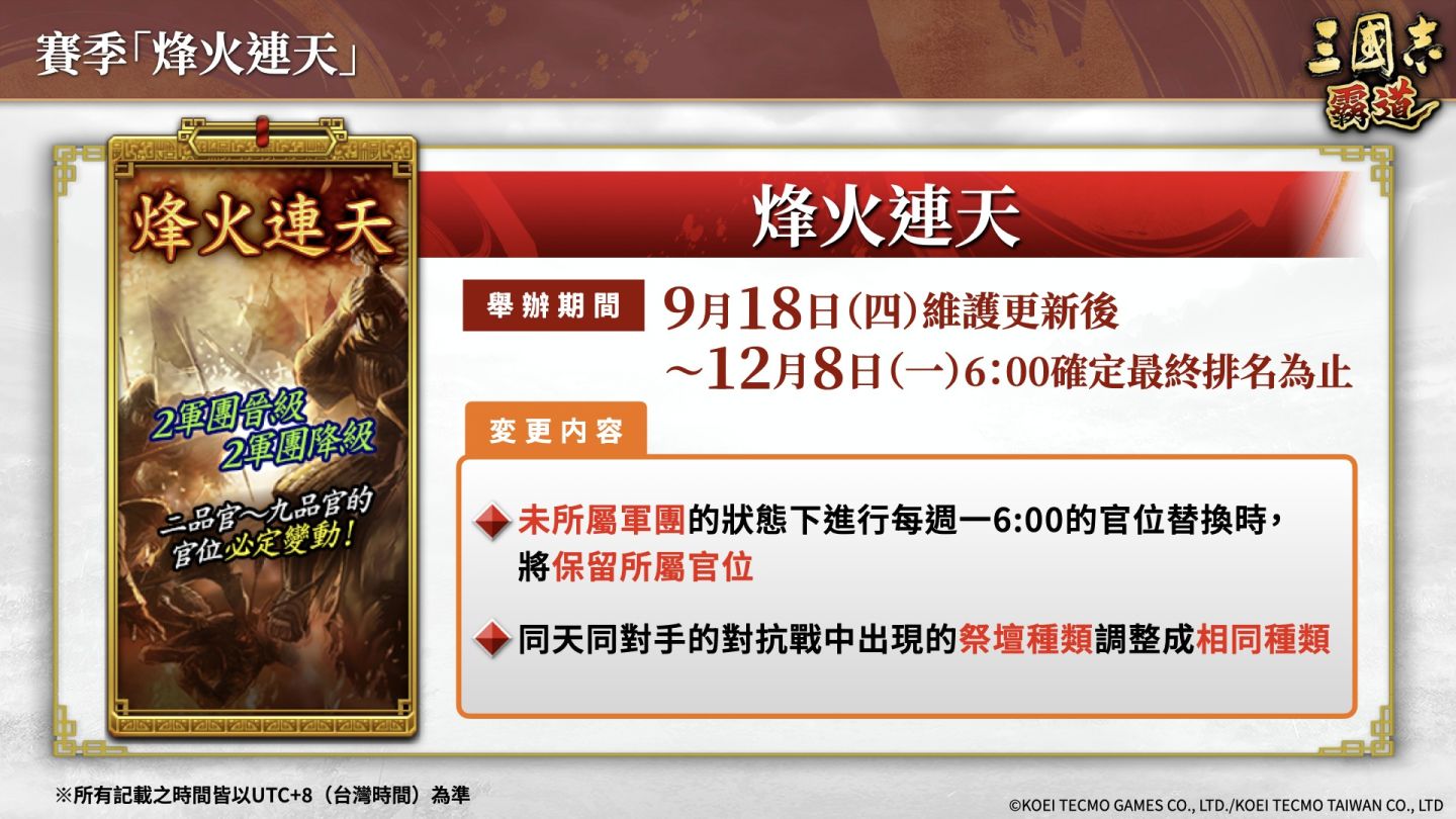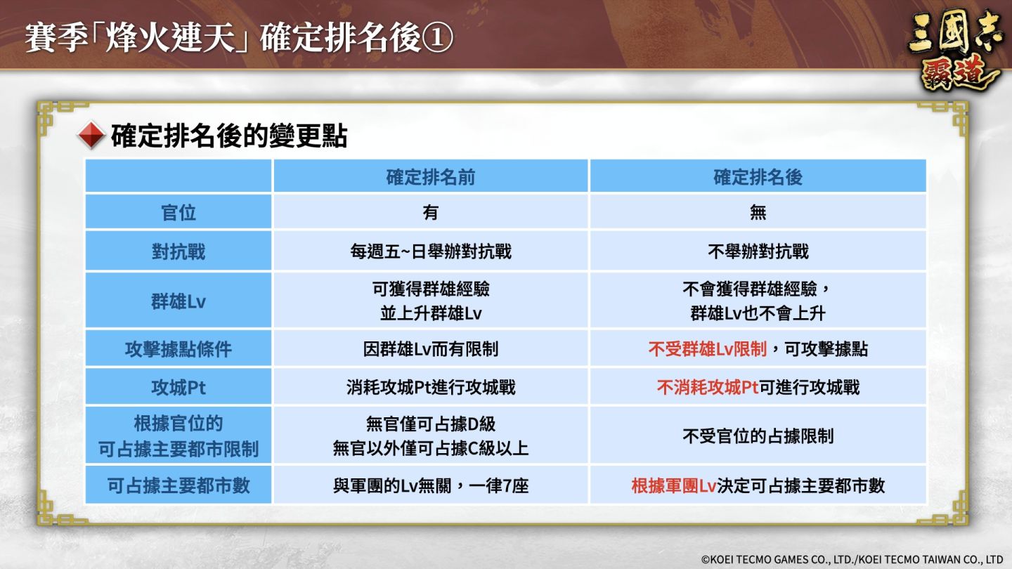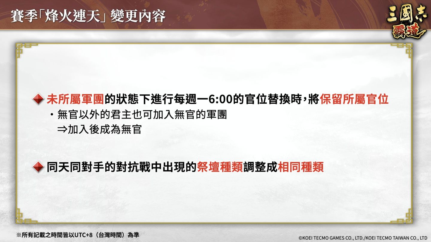 同時,今日起將調整賽季「烽火連天」的部分規則。若官位替換時未隸屬於軍團,將不會變為無官而是直接屬於該官位。以及,無官以外的君主也可以加入無官的軍團。藉此可以更方便的遷移至更接近官位的軍團。若無官以外的君主加入無官的軍團,該君主將會成為無官。同一天相同組合的對抗戰中出現的祭壇將會是同一種類,可以享受規則更加公平的對抗戰。