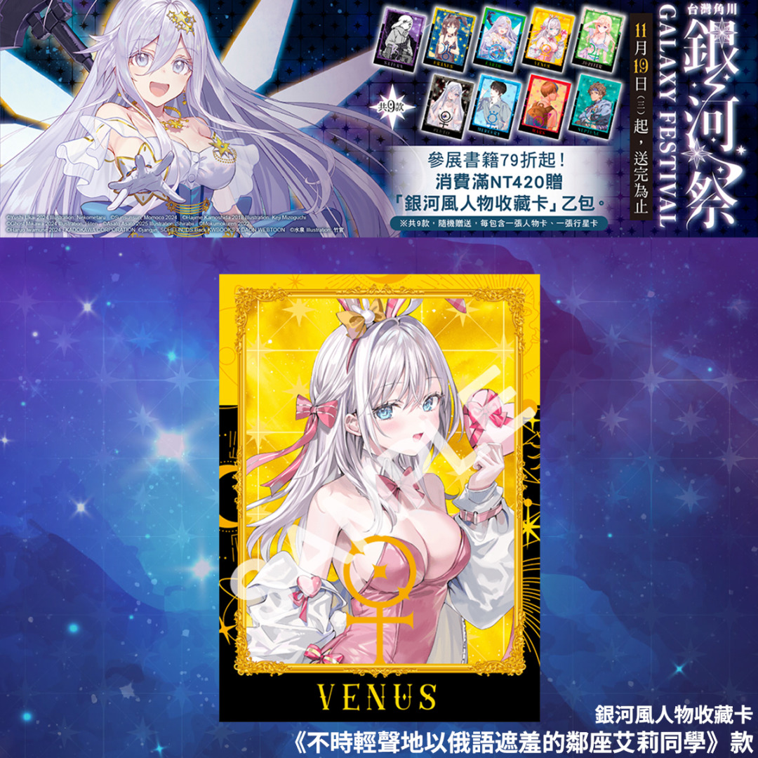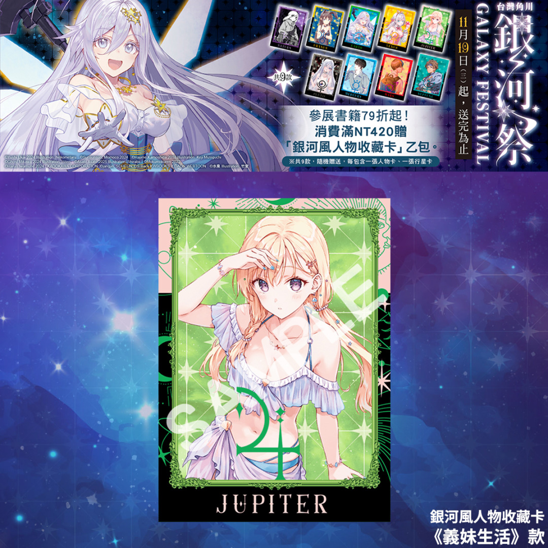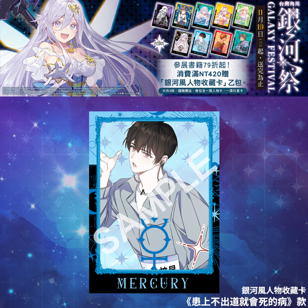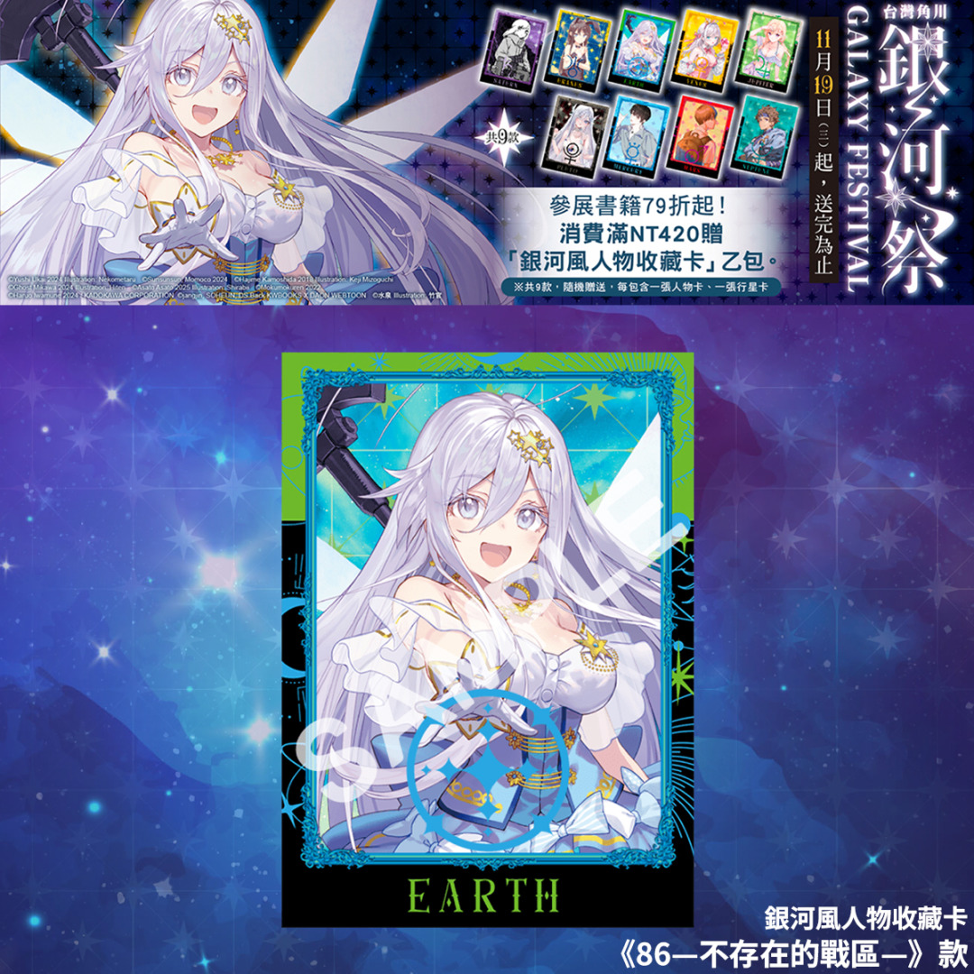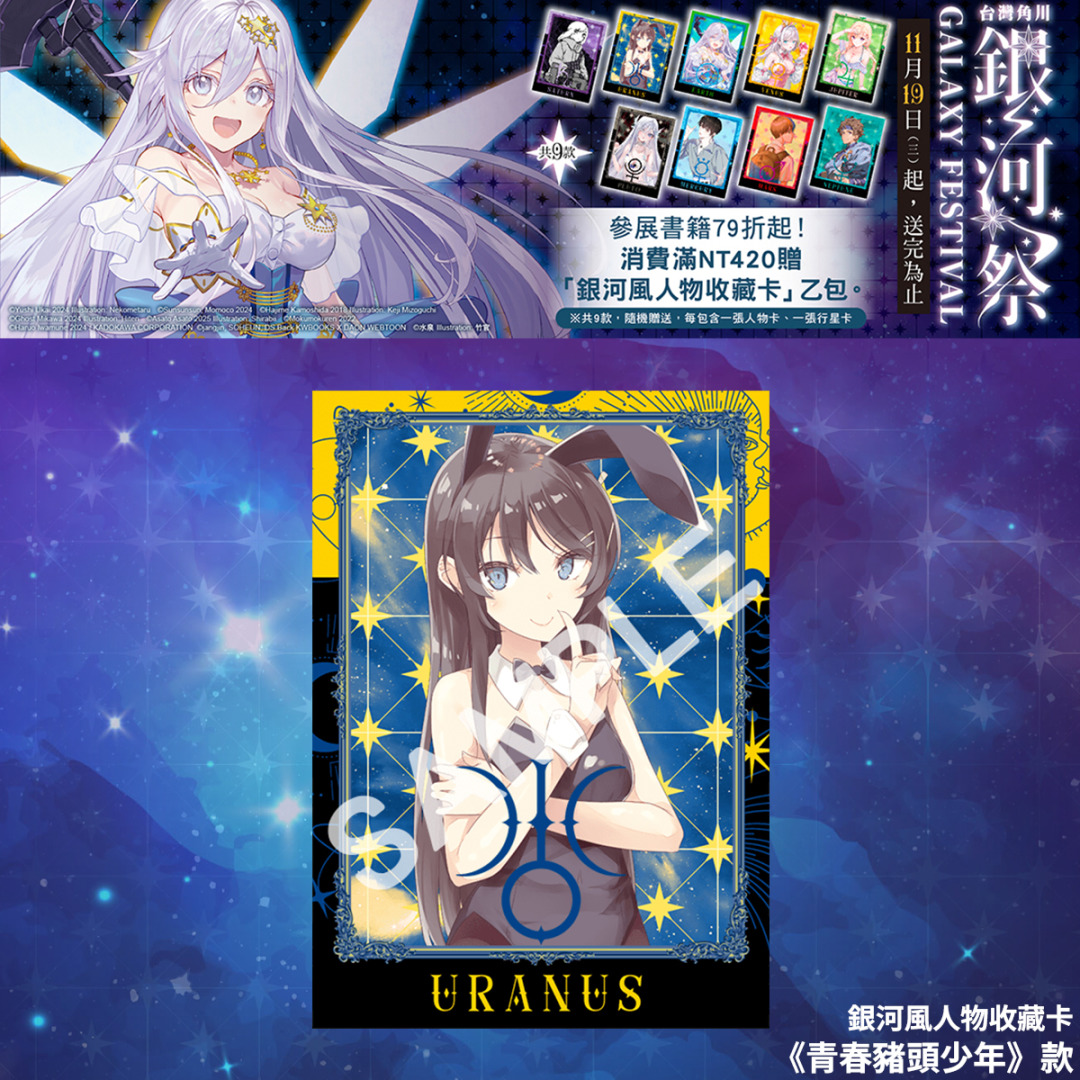 凡於台灣角川官網及指定通路購買台灣角川出版之漫畫、輕小說、畫冊、華人原創、輕.文學、精品,單筆消費滿420元,即可獲得散發星河之光的「銀河風人物收藏卡」乙包。※共9款,隨機贈送,送完為止。