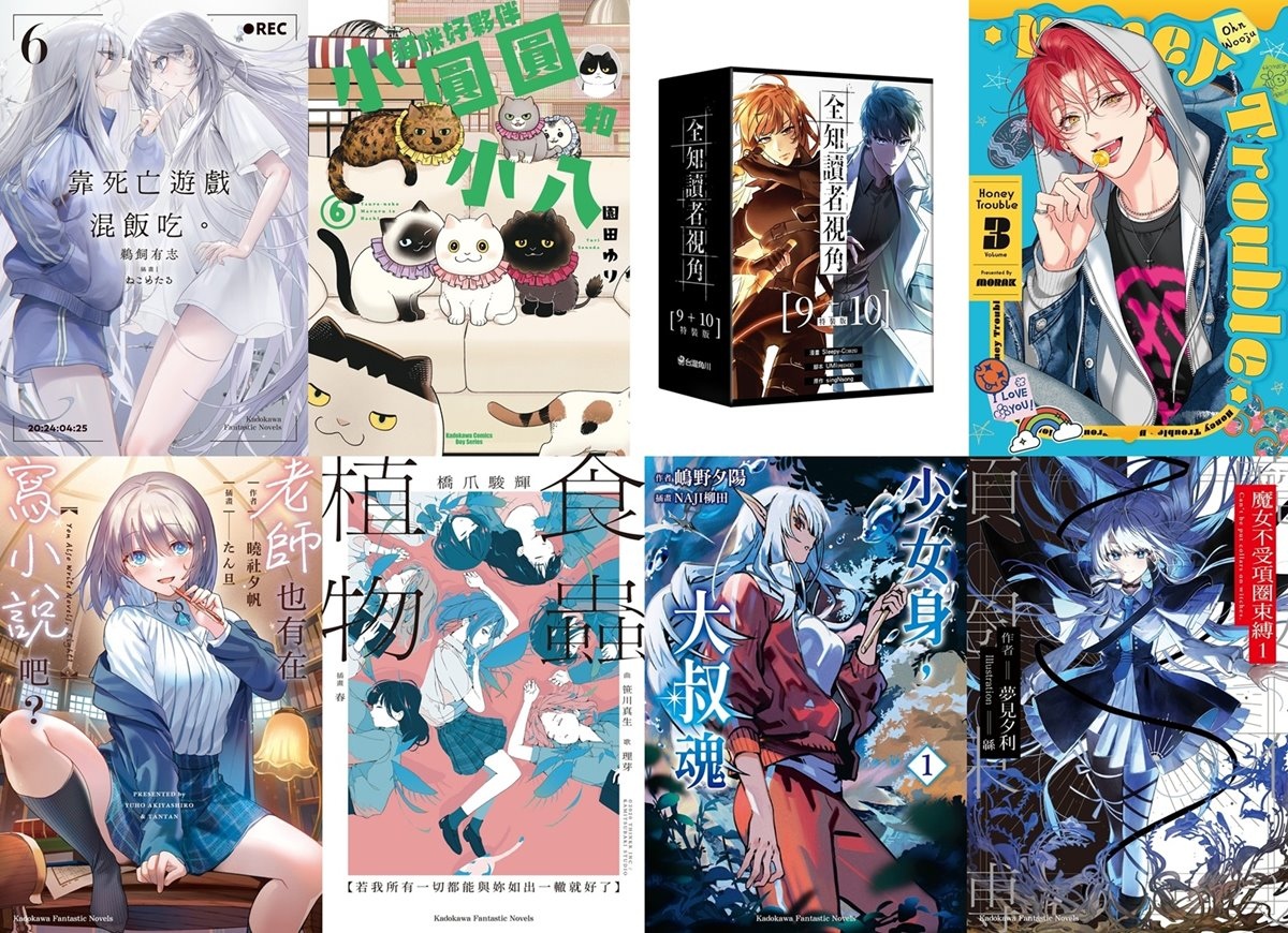 台灣角川「2025銀河祭」近期推薦強檔新書 ——日本動畫預定 2026 年 1 月開播的《靠死亡遊戲混飯吃。(6)》【特裝版】、流浪貓雙主角再度登場的感人系列《貓咪好夥伴小圓圓和小八 (6)》【特裝版】、全球矚目的韓國現象級奇幻鉅作《全知讀者視角 (9+10)》【特裝版】、萬眾矚目的韓國BL話題作《Honey Trouble 3》【特裝版】、以現實與虛構交錯為主題的《老師也有在寫小說吧?》、以跨界合作再現青春共鳴,改編自超人氣歌曲的小說《食蟲植物【若我所有一切都能與妳如出一轍就好了】》、顛覆定番公式的奇想轉生喜劇《少女身,大叔魂 (1)》、第 30 屆電擊小說大賞「大賞」得主《魔女不受項圈束縛 (1)》……等,眾多精彩作品將於近期陸續上市。
