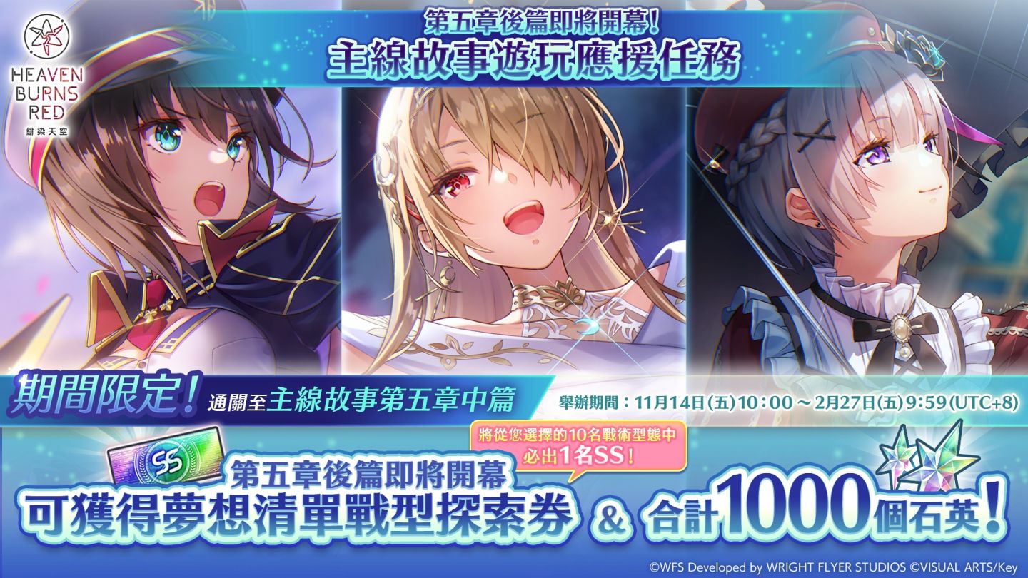 慶祝主線故事第五章後篇決定開幕,可獲得第五章後篇即將開幕夢想清單戰型探索券和合計 1,000 個石英的主線故事遊玩應援任務實施中!