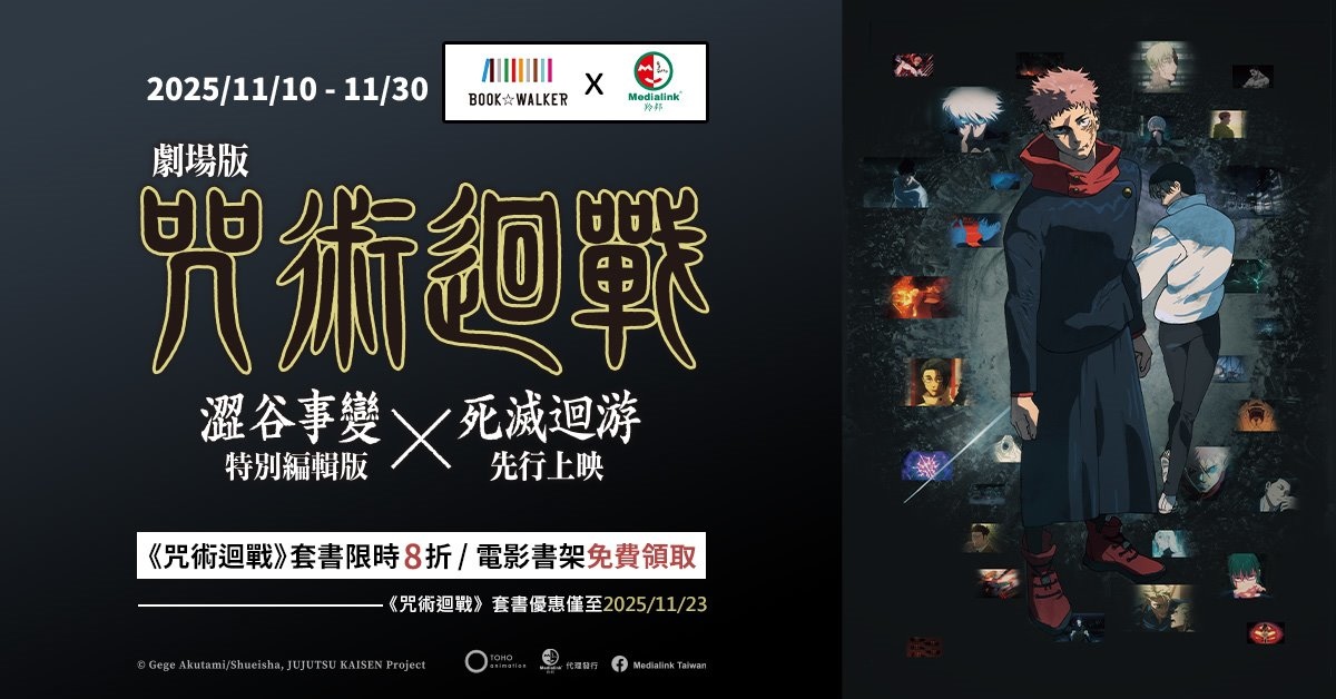 《劇場版 咒術迴戰 澀谷事變×死滅迴游 先行上映》於 11 月 14 日登上大銀幕與各位相見啦!BOOK☆WALKE 本次攜手動畫代理商「羚邦」於 11 月 10 日至 11 月 30 日推出特別企劃,特別製作「虎杖悠仁」、「五條悟」與「七海健人」3 款角色電影書架封面讓讀者們可以免費領取,11 月 23 日前《咒術迴戰》套書更有限時 8 折優惠,全套 30 冊原價 2,400 元、活動期間只要 1,920 元就能收藏!本次劇場版描繪《咒術迴戰》中前所未有的大規模詛咒之戰「澀谷事變」以及殘殺遊戲「死滅迴游」的先行上映,喜歡《咒術迴戰》的讀者們千萬不能錯過!