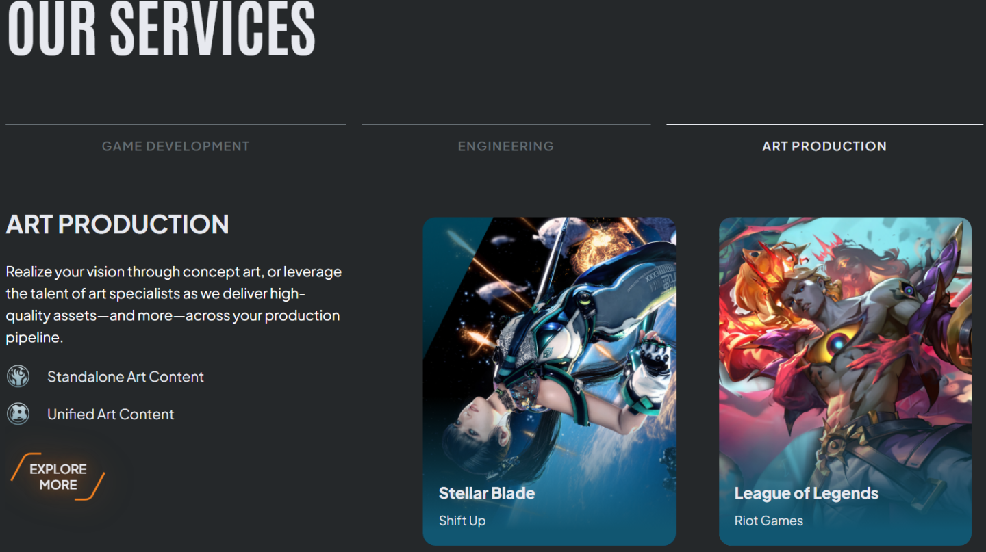 不過 Virtuos Korea 有一個更核心的目標:啟動「設計專案」包含遊戲設計、關卡設計,甚至是協助客戶新 IP 的開發,Philippe Angely 直言:「我們相信,韓國發行商正坐在一座『金礦』上,但他們對這座黃金有點不知怎麼處理,所以我們帶來的主機平台的專業知識,因為我們已經在這領域深耕 20 年,可以提供他們額外團隊去重啟或者多樣化他們的 IP,如今已經與韓國開發商合作長達 16 年,合作的對象包括 NCsoft、Nexon、連續 10 年的 Smilegate 和 Shift Up 等新開發商,幾乎是所有的韓國開發商都涵蓋到」