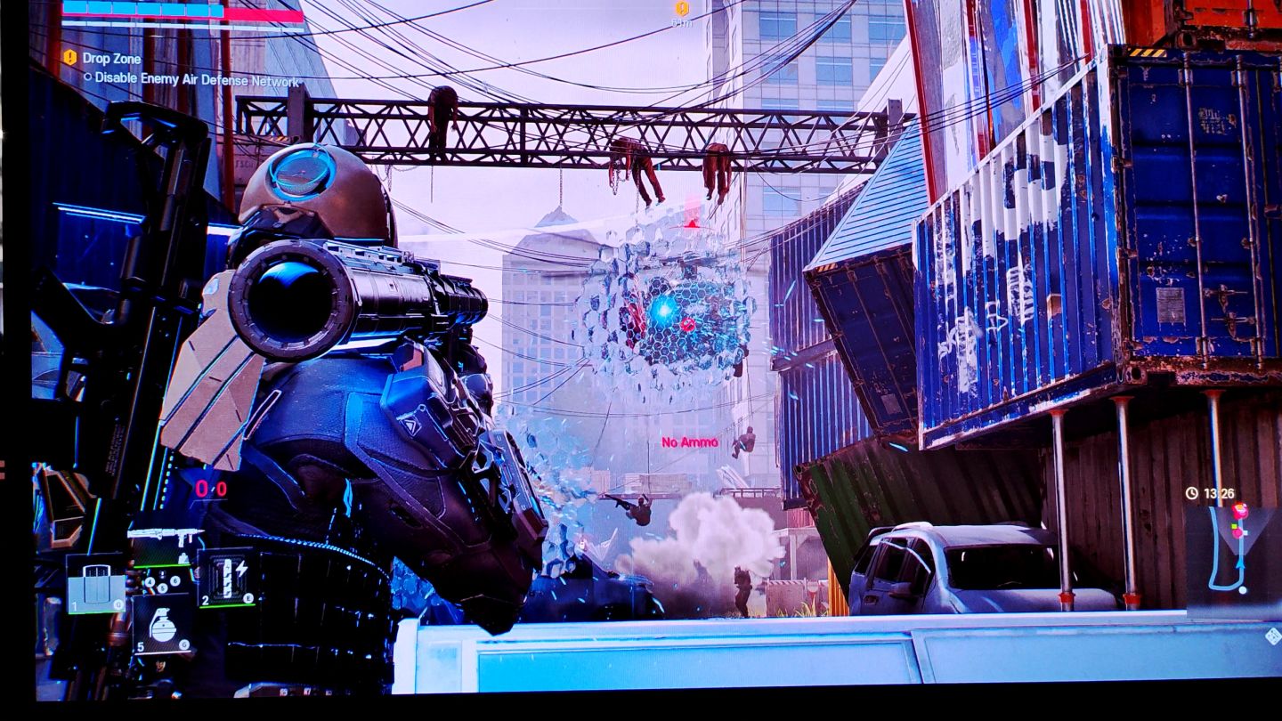 此外,遊戲中也允許玩家啟動「戰術裝備」,為自己上防彈護盾、發動多重導彈等技能,格外注意的是子彈數量是需要空頭補給箱來提供,或者是擊敗敵人後取得武器裝備更換,可以裝備手槍、衝鋒槍、狙擊步槍等武器,敵人的攻勢也相當猛烈,幾乎是往玩家角色死裡打,一旦戰敗就會從檢查點出現,而推進檢查點的方式就是完成戰術目標,例如關閉敵人的防空設施。