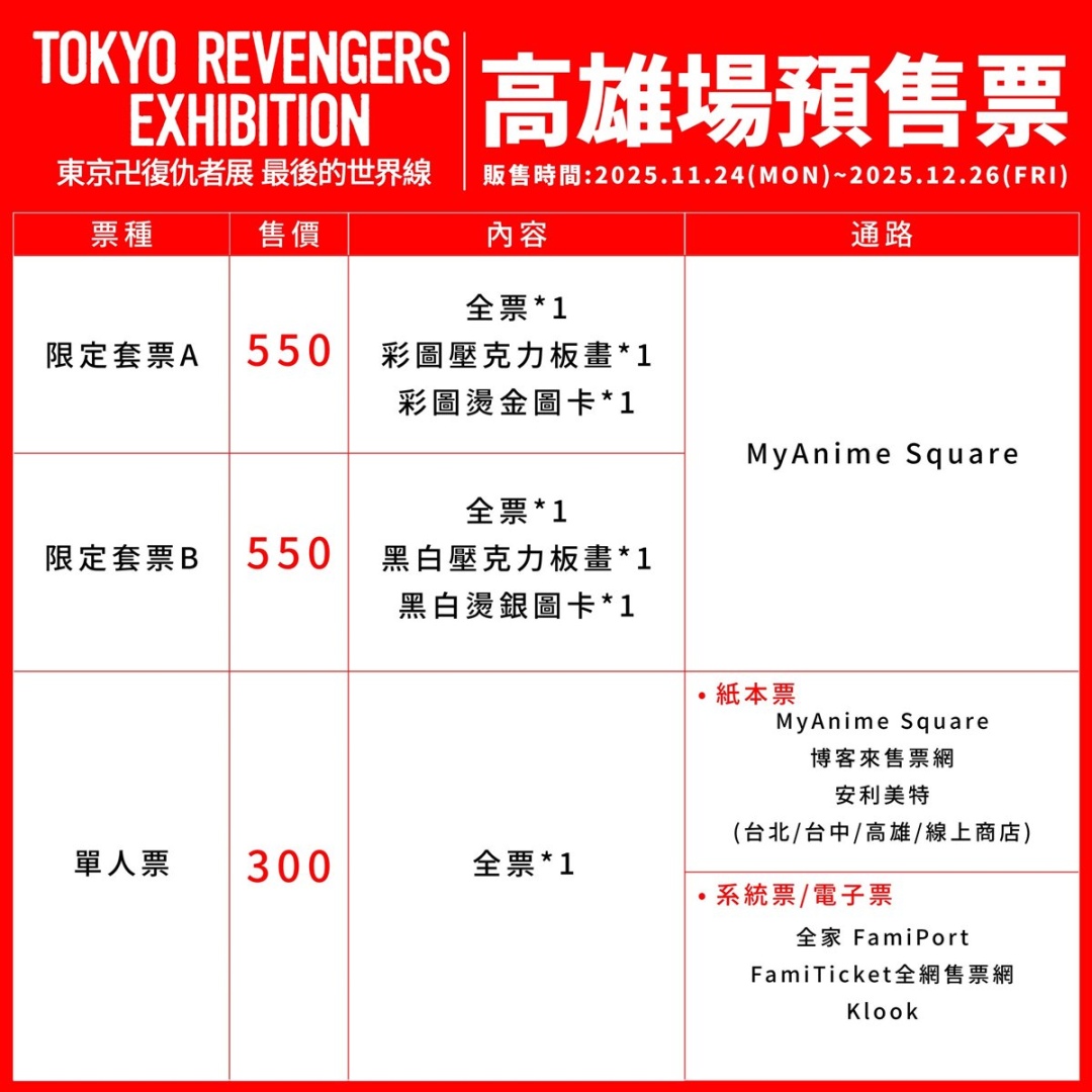 首先登場的高雄場預售票將於 11/24 開賣,推出以 2 種展覽主視覺為設計的限定特典,以華麗彩色主視覺呈現的壓克力板畫及燙金圖卡,另一種以俐落印象的黑白主視覺設計的壓克力板畫及燙銀圖卡,兩種不同風格的「東卍」魅力,絕對值得每位粉絲珍藏,限定票數量有限售完為止。台北場預售票資訊將於12月上旬公開,敬請期待。
