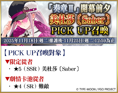 即日起至 11 月 29 日(六)15:59 期間,限定從者「★5(SSR)美杜莎〔Saber〕」、「★5(SSR)杜爾迦」及劇情卡池從者「★5(SSR)怖軍」等在內的 4 騎從者,將在『「奏章Ⅱ」開幕前夕紀念活動』的 3 種召喚卡池中登場。