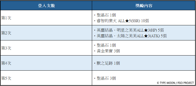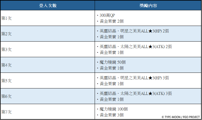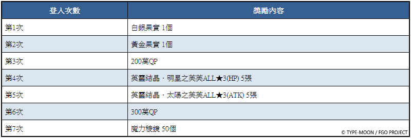 於 11 月 19 日(三)4:00~11 月 27 日(四)3:59 期間,通關「特異點F 燃燒污染都市 冬木」的御主,活動期間內登入 7 次(1 天計 1 次),即可獲得白銀果實 1 個、黃金果實 1 個、英靈結晶.明星之芙芙 ALL★3(HP)5 張、英靈結晶.太陽之芙芙 ALL★3(ATK)5 張、500 萬 QP、魔力稜鏡 50 個等獎勵。