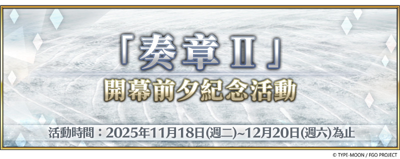 為了即將開幕的「奏章Ⅱ」,今日維護後至 12 月 20 日(六)23:59 期間將舉辦『「奏章Ⅱ」開幕前夕紀念活動,活用活動推進主線任務,為「奏章Ⅱ」做好準備!