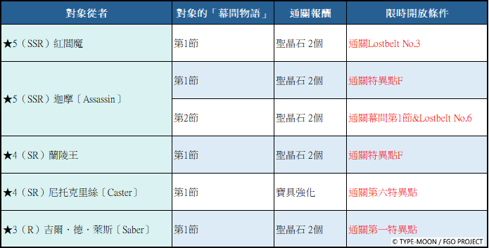 此外,「Lostbelt No.7」&「奏章I 虛數羅針內界 平面之月」相關從者的「幕間物語」,在活動期間內將限時變為特別開放條件,即使尚未擁有對象從者也可以開放,通關完成可領取聖晶石等獎勵。