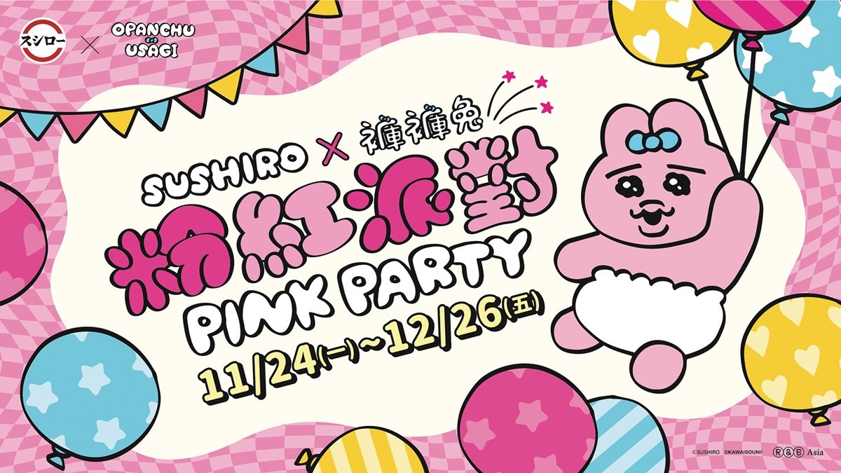 台灣壽司郎與可愛又可憐的日本超人氣角色《褲褲兔》於 11 月 24 日(一)起攜手舉辦壽司郎×《褲褲兔》「粉紅派對」聯名活動。除了各式聯名餐點、周邊商品外,全台共 6 家粉紅派對主題店也熱鬧登場!