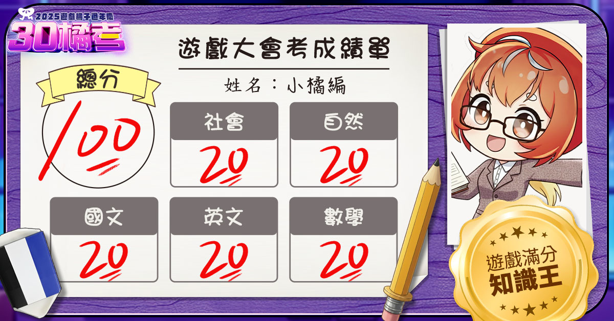 題目巧妙融入各遊戲角色設定、世界觀、經典場景與玩法冷知識,橫跨國文、英文、數學、自然、社會五大領域,既燒腦又戳中回憶。考生可透過遊戲橘子官方 Facebook 聊天機器人輕鬆作答,完成測驗將獲得專屬電子成績單,不僅為遊戲旅程留下紀念,亦可勇闖高分榜、挑戰「滿分遊戲知識王」的榮耀寶座!