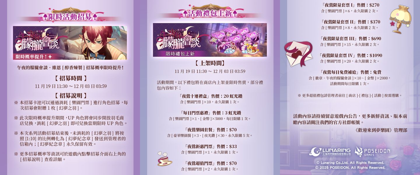 Poseidon Games 代理發行的女性向手遊《歡迎來到夢樂園》,今(19)日開啟全新的劇情主題限定卡池「夜鶯邀約・午夜的朦朧會談」,也同步推出專屬限定活動劇情、活動關卡、等遊戲內容。